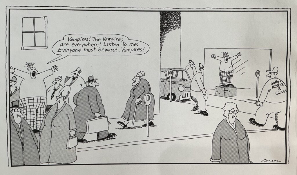April starts off with April Fools Day, and we will focus on humor. Every day, we will reflect on a different Far Side cartoon from long, long, long ago…